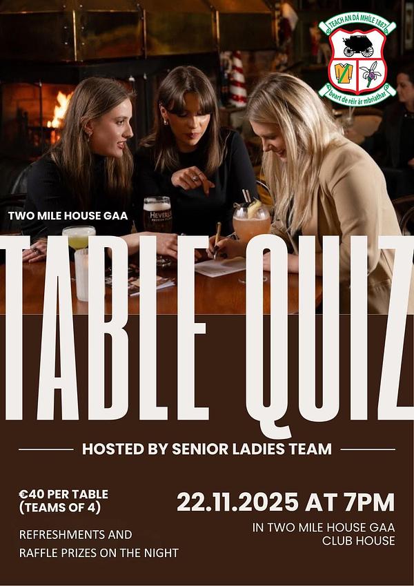 ๐๐Mark your Diaries - Table Quiz Night hosted by our Senior Ladies Sat 22nd November 2025. Table of 4 โฌ40. Book your table via the link in ClubZap shop. Everyone Welcome!!๐๐